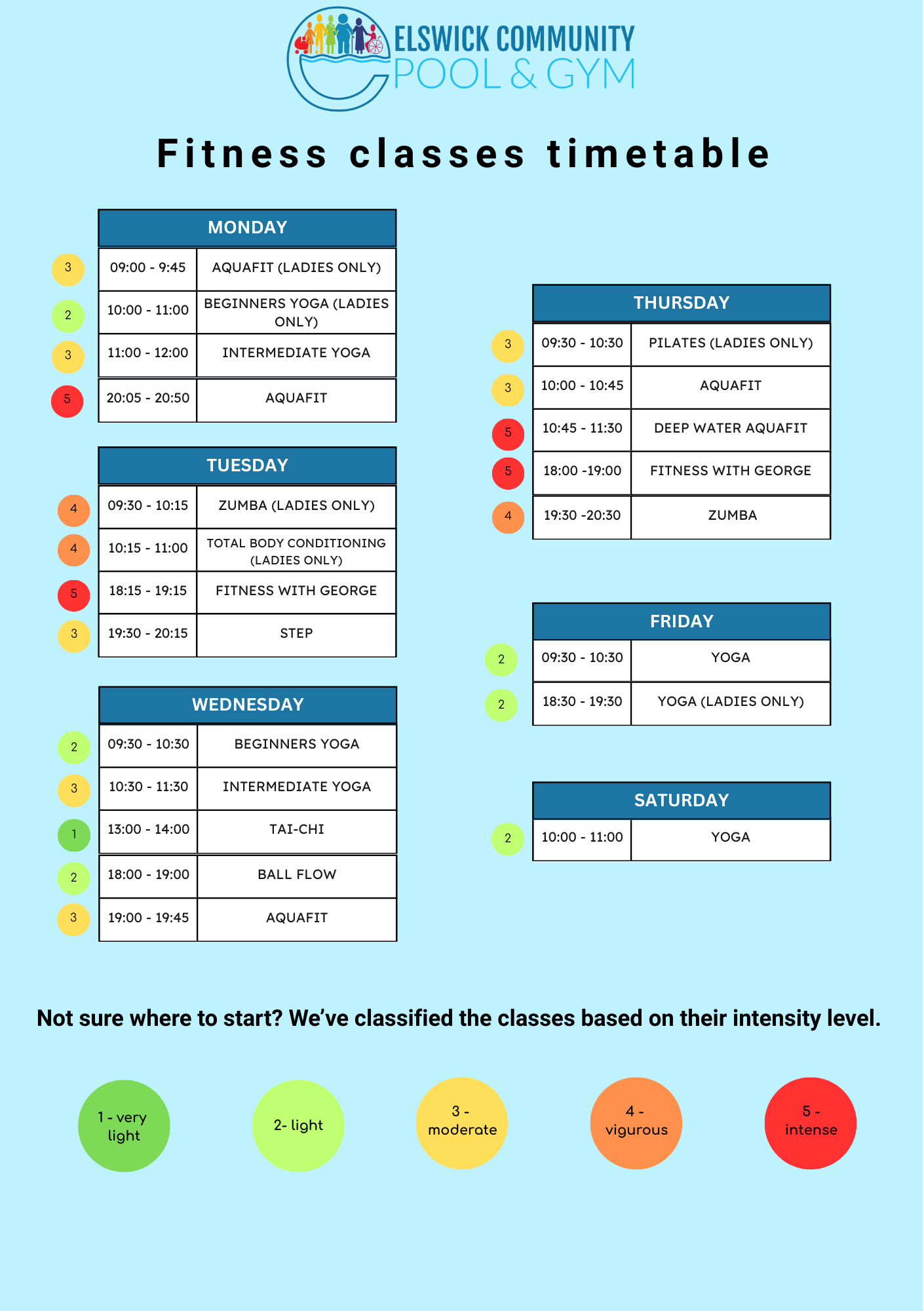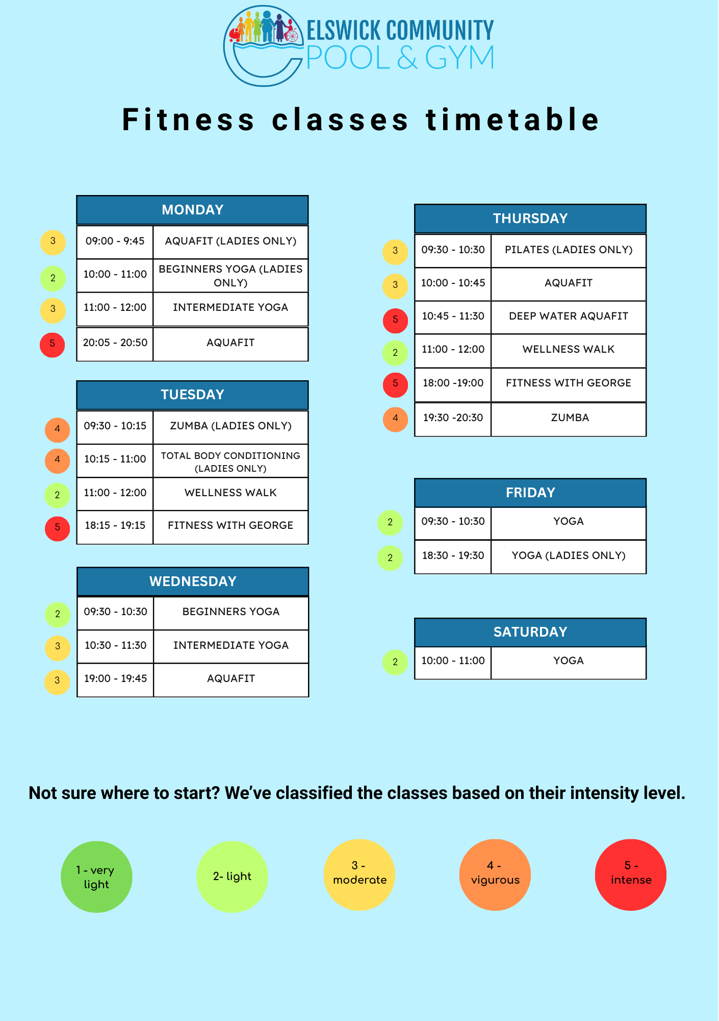 Looking to stay active and have fun? Then you’ve come to the right place. At Elswick Community Pool & Gym, we offer a variety of fitness classes designed for all levels, from energising cardio workouts to relaxing yoga sessions. Below, you’ll find a full list of our fitness classes along with the timetable—so you can find the perfect session to fit your schedule.